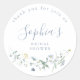 Élégant couronne de fleurs sauvages aquarelle délicate encadre vos détails d'événement. Palettes pastel de jaune doux, blanc cassé, vert sauge, bleu poussiéreux et verdure botanique, simples et romantiques. Autocollants de favori de shower de mariée 'quelque chose de bleu' pour une baby shower rustique moderne, un shower de mariée de jardin campagnard et une fête bohème bleu poussiéreux au printemps et en été.