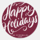 Un autocollant de vacances moderne avec un arrière - plan bordeaux et l'expression "vacances heureuses" en lettres blanches surdimensionnées. Personnalisez cet autocollant avec votre nom. Parfait pour sceller des cadeaux et des gâteries de vacances.
