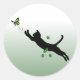 Un chat noir aux yeux verts sautant dans l'air en essayant d'attraper un beau papillon vert.