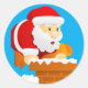 Cette image est un sticker de vacances joyeux montrant le Père Noël dans son costume rouge classique et casquette, émergeant joyeusement d'une cheminée en brique avec de la neige sur le dessus. Son grand sac de cadeaux est visible derrière lui, et une bouffée de fumée monte de la cheminée, capturant le moment magique de la veille de Noël. Un design festif et ludique, parfait pour les décorations de vacances, les cartes ou l'utilisation numérique.