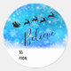Des autocollants de marque cadeau de Noël avec une silhouette noire de Père Noël à cheval dans son traîneau tiré par son renne volant à travers le ciel. Croyez écrit dans une police de script tendance. L'arrière - plan est un modèle de flocon de neige glacé bleu glacé.