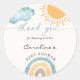 Elégant baby shower de calligraphie merci autocollant avec soleil et aquarelle arc-en-ciel design.
