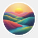 Une illustration d'art numérique moderne enfermée dans un cercle, présentant un paysage stylisé de collines ondoyantes dans des dégradés riches et saturés.