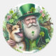 Cette photo d'un leprechaun tenant un chien figure sur cet autocollant rond pour la Saint Patrick. Cet autocollant peut être utilisé pour les mailings de la Saint Patrick, la décoration, le scrapbooking et plus encore!