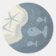 Une scène amusante avec quelques baleines caricaturales dans un océan bleu, étoiles de mer aussi !
