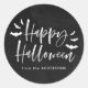 Autocollants d'Halloween festifs et amusants avec "Happy Halloween" dans une police de caractères blanche, lettrée à la main, accentuée par des chauves-souris volantes sur un arrière - plan de tableau noir. Personnalisez ces autocollants Halloween personnalisés avec votre nom ou autre texte personnalisé. Parfait pour sceller les enveloppes, décorer les faveurs de la fête d'Halloween, et ajouter une touche festive aux cadeaux, traiter les sacs, et plus encore.