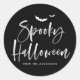 Autocollant rond classique Lettre calligraphiée pinceau Halloween épouvantable Merci. Envoyez vos vœux d'Halloween à votre famille et à vos amis avec cet autocollant personnalisable. Il présente une lettre calligraphiée avec une illustration de chauve-souris. Cet autocollant d'Halloween amusant et moderne est parfait pour les invitations, les cartes et les cadeaux de fête. Personnalisez-le en ajoutant vos propres détails.