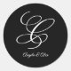 Créez votre propre autocollant monogramme "lettre C" ou "C initial". Les couleurs noir et blanc sont personnalisables pour correspondre à votre palette de mariages. Supprimez les prénoms du couple si vous le souhaitez. Ajoutez une date de l'anniversaire du mariage. Si vous supprimez le texte personnalisé, vous pouvez centrer l'image monographique.