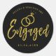 Un autocollant amusant et unique en or sur fond noir, écrit en lettres de scénario, spécialement conçu pour vous pour une fête de fiançailles. Il comporte le mot "fiancés" en or avec des anneaux de mariage en or reposant dessus. En dessous et au-dessus de ceci figurent les noms de la mariée et du marié ainsi que la date des fiançailles.