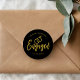 Un autocollant amusant et unique avec une écriture manuscrite or sur fond noir, spécialement conçu pour vous pour une fête de fiançailles. Il comporte le mot "fiancés" en or avec des anneaux de mariage en or reposant dessus. En dessous et au-dessus figurent les noms des mariés et la date des fiançailles.