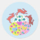 Cet autocollant coloré présente mon design débordant d'énergie avec trois lièvres sautant par-dessus un groupe d'œufs de Pâques brillamment décorés.