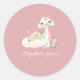 Lama blanc doux et adorable avec des fleurs sur un autocollant rond rose avec nom bébé.