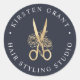 Étiquette votre correspondance ou vos produits avec ces autocollants chic qui correspondent à notre suite de marque du logo des ciseaux floraux pour coiffeurs et salons. Les autocollants bleu marine riches présentent au centre un faux ciseaux doré, avec deux champs de texte courbant autour de l'extérieur, en lettres blanches classiques.