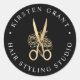 Étiquette votre correspondance ou vos produits avec ces autocollants chic qui correspondent à notre suite de marque du logo des ciseaux floraux pour coiffeurs et salons. Les autocollants noirs riches présentent au centre une illustration de ciseaux de feuille d'or faux, avec deux champs de texte courbant autour de l'extérieur, en lettres blanches classiques.
