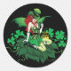 Fée irlandaise aux cheveux roux tout en vert pour la Saint Patrick's Day avec sa casserole d'or et de trèfle vert.
