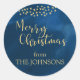 Un autocollant rond bleu de minuit est orné d'étoiles dorées et de typographie de caractères de script disant "Joyeux Noël" dans la même nuance d'or. Customisez avec votre nom sur le modèle facile à utiliser. L'autocollant de 1,5 pouce a été conçu comme un sceau d'enveloppe, mais vous pouvez également changer le style en un autocollant de 3 pouces pour utiliser comme étiquettes cadeaux sur vos cadeaux emballés. Une partie de la collection "Lumière dorée de Noël". #holidayZ