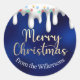 Ce étiquette autocollant de vacances présente un design de Noël coloré et festif sur un arrière - plan de texture bleu brillant. Une série de lumières est placée sur la neige fondante sur la partie supérieure. Un message de voeux "Joyeux Noël" est imprimé dans le centre en écriture dorée. Un exemple de nom de famille est imprimé en bas, que vous pouvez personnaliser pour inclure votre propre nom personnalisé ou un autre texte.