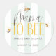Sticker Mama to Bee Honey Green Baby shower Classic Round Sticker présente un arrière - plan rayé chic et des abeilles délicates à l'aquarelle.