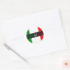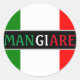Ce étiquette autocollant personnalisé comporte l'expression "mangiare" imprimée sur le centre. Mangiare est la traduction italienne pour "manger" et il est imprimé aux couleurs du drapeau italien. Les trois premières lettres sont vertes, les deux secondes sont blanches, et les trois dernières sont rouges. Il est imprimé sur le drapeau italien.