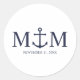 Ajoutez une touche élégante à votre mariage nautique avec cet autocollant cadeau de mariage bleu marine classique. Conçu avec une illustration d'ancre bleu marine, il présente un monogramme personnalisé de mariée et de mariée, le nom et la date du mariage dans une police serif bleu marine sur un arrière - plan blanc. Parfait pour les mariages nautiques, les mariages sur la plage et plus.