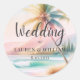 Autocollant de mariage à l'océan avec palmier de plage aquarelle. Personnalisez-le avec votre propre nom et date pour le rendre unique. Parfait pour une destination de plage ou un mariage sur le thème de l'océan !