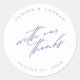 Élégant texte manuscrit manuscrit "avec nos remerciements" dans un simple mais frappant autocollant de faveur montré ici qui contient également vos noms et date mariage dans periwinkle sur blanc. Recherchez ID954 pour voir d'autres produits et choix de couleurs pour cette suite mariage.