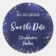 Un autocollant Enregistrer la date pour votre mariage. Un arrière - plan bleu marine, texte blanc. La couleur bleue est inégale. Décoré de faux éclats d'argent. Personnalisez et ajoutez vos noms et votre date de mariage.