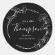 Un élégant autocollant rond avec arrière - plan noir et texte blanc. Une couronne botanique dessinée à la main avec des feuilles japonais modernes du ginkgo entoure le texte. Parfait pour les mariages, merci les cartes et beaucoup plus ! Tous les textes peuvent être personnalisés et édités à votre gré.