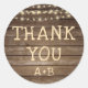 Autocollants de remerciement de mariage avec un fond rustique de planche de bois brun patiné et une douce lueur jaune de guirlande lumineuse ainsi que le titre de MERCI et vos initiales dans une police manuscrite country western. Utilisez comme sceaux d'enveloppe ou pour les faveurs de mariage. Contactez le concepteur via Zazzle Chat ou makeitaboutyoustore@gmail.com si vous souhaitez que ce design soit modifié, sur un autre produit ou des articles assortis.