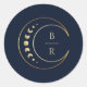 Scellez votre thème céleste avec le "Sticker rond bleu Celestial Mariage" contre un arrière - plan bleu chic. La lune et les étoiles du croissant, complétées par les initiales élégamment simples personnalisables du couple, deviennent un emblème enchanteur. Les phases de lune délicatement incorporées ajoutent une couche de symbolisme, ce qui rend ces autocollants plus que de simples sceaux décoratifs.