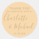 Champagne et or signature mariage faveur merci sticker rond classique avec des noms de style signature. Personnalisez avec vos informations de remerciement spéciales en typographie chic. Conçu par Thisisnotme©