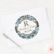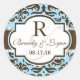Design de mariage élégant et mignon sur élégant motif damassé vintage bleu clair et marron foncé avec police marron. Peut être utilisé pour mariage, douche de couple, fiançailles, faire-part fiançailles ou enregistrer la date. Personnalisé avec le nom de la mariée et du marié, le monogramme et la date du mariage. Notre boutique, Favors and Decor, se spécialise dans les décorations événementielles et les faveurs festives.