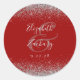 Cet élégant autocollant mariage moderne présente une parties scintillant en faux argent sur le haut et le bas. Customisez facilement le texte blanc sur un arrière - plan rouge crimson, avec les noms du couple en gris argenté calligraphie d'écriture manuscrite sur une grande esperluette.