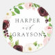 Scellez vos enveloppes ou faveurs d'invitation avec ces élégants stickers de mariage fleuris avec vos noms encadrés par une couronne d'aquarelle de feuillage vert luxuriant et des fleurs en marsala rose, ivoire et bordeaux. Personnalisez avec vos noms dans le lettrage classique de noir accentué avec script de calligraphie. Coordonnée avec notre collection de mariages Blush Romance.