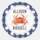 Un autocollant mariage illustrant l'illustration d'un crabe sur un arrière - plan en vichy bleu.