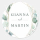 Ce faire-part de mariage est orné d'eucalyptus à aquarelle peinte et de feuilles verts botaniques avec un cadre géométrique or.