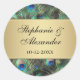 Cadeau de mariage ou autocollants d'enveloppe. Arrière - plan élégant et raffiné en plumes de paon dans les riches couleurs saturées de bleu royal, or de cuivre et vert émeraude turquoise. Le paon est un oiseau majestueux avec des plumes ornementales et il fait un bel affichage pour un mariage d'été ou toute occasion Les gradients métalliques d'or ajoutent une touche de glamour et de raffinement.