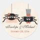 Ce couple adorable est plus sucré que éffrayant ! La mariée porte un voile de pêche pâle et de corail avec une pince à cheveux fleurie avec un faux look diamant imprimé en strass solitaire (S'il vous plaît, notez, aucun ornement en trois dimensions n'a été ajouté à l'oeuvre). Le dapper groom porte un chapeau gris et orange et une cravate arc. Le couple mignon est accroché à une toile d'araignée d'or sur un arrière - plan parchemin antique et vintage. Il peut être personnalisé et customisé avec les noms du couple et la date de l'événement. Ce design est parfait accompagnement papeterie pour une douche à thème d'octobre, d'automne ou d'Halloween, mariage ou douche nuptiale. Oeuvre © Chrissy H. Studios, LLC. Tous droits réservés.