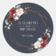 Moderne, élégant et tendance, cet autocollant mariage rond classique présente une géométrie en faux cuivre agrémentée d'une végétation d'eucalyptus aquarelle et d'arrangements floraux bordeaux et roses, sur une texture bleu marine moderne. Fait partie d'un ensemble correspondant. Copyright Invitations élégants. Tous droits réservés.