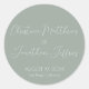 Cet évènement ou autocollant mariage moderne et élégant présente un arrière - plan vert eucalyptus simple avec texte blanc. Les noms du couple sont imprimés dans une police de script. La date et l'emplacement du mariage sont imprimés ci-dessous.