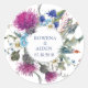 Elégant Autocollant écossais mariage sceaux avec un beau thème floral. On y trouve le chardon magenta, fleur officielle d'Ecosse, avec des marguerites, des oubliettes, des saints de la mer bleue et d'autres fleurs. Customisez le texte avec vos informations de mariage. Correspondance d'objets dans mon magasin.