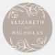 Élégants autocollants de mariage fleuris avec des fleurs blanches et des feuilles avec un arrière - plan taupe. Personnalisez les autocollants de mariage floral avec vos noms. Les autocollants à fleurs sont parfaits pour sceller les enveloppes mariages, les faveurs de mariage, et plus encore! Conçu pour coordonner avec notre collection de mariages floraux esquissés.