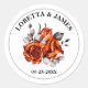 Phoques de l’enveloppe de faire-part de mariage fleurie rose d’orange brûlée portant le nom de la mariée et du marié et la date du mariage.