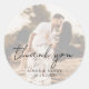 Autocollants de mariage photo modernes présentant un design simple avec "merci" dans un style d'écriture rustique ainsi que vos noms et date de mariage sur votre photo préférée avec un overlay opaque. Cet autocollant de mariage élégant avec une mise en page minimaliste est idéal pour personnaliser les faveurs pour tout style de mariage.