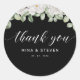 L'Autocollant Mariage Merci moderne Floral Noir Classic Rond dispose d'un arrière - plan noir élégant décoré d'élégants motifs floraux, parfait pour ajouter une touche sophistiquée et contemporaine pour vous remercier notes et faveurs de mariage.