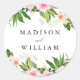 Élégants autocollants de mariage fleuris portant vos noms entourés de vaporisateurs floraux de fleurs rose, rousse et pêche à l'aquarelle avec des feuilles verts. Les autocollants de mariage à fleurs roses sont parfaits pour être utilisés comme scellés d'enveloppe, faveurs de fête, etc. Conçu pour coordonner avec notre collection de mariages floraux rose pâle.