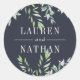 Scellez vos enveloppes d'invitation ou vos faveurs avec ces élégants autocollants de mariage botanique avec vos noms encadrés par une bordure supérieure et inférieure de verdure et de feuillage d'aquarelle luxuriante sur un riche arrière - plan bleu marine. Coordonnée avec notre collection de mariages Winter Sage.