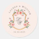 Elégant blason aquarelle avec fleurs douces sur fond rose pâle avec autocollant rond initial du couple pour mariage romantique.