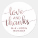 Ces autocollants en or rose vous remercient pour votre mariage sont parfaits pour un mariage moderne. Le design comporte de belles feuilles d'or faux rose calligraphie moderne et confetti. Personnalisez les étiquettes autocollants avec le nom de la mariée et du marié et la date du mariage. Remarque : Ce design ne présente pas de véritable feuille d'or rose. C'est un graphisme de haute qualité fait pour ressembler à de l'or rose chatoyant.