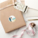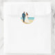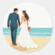 Comprend 20 petits autocollants sur une feuille. Illustration adorable d'une mariée et d'un marié se promenant main dans la main sur la plage, parfaite pour les célébrations de mariage et les gestes romantiques.